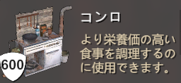 食料アイテムを使って調理できる。コンロからでないと入手できない食料がある。