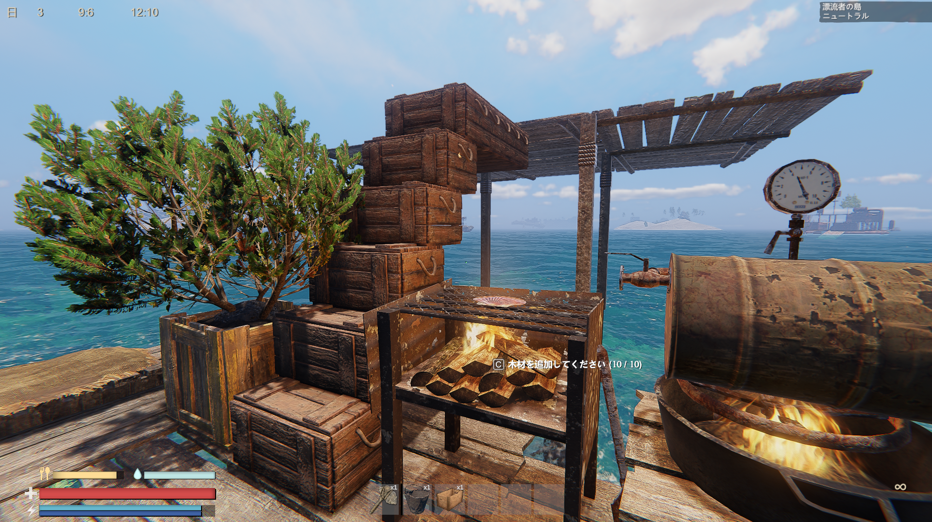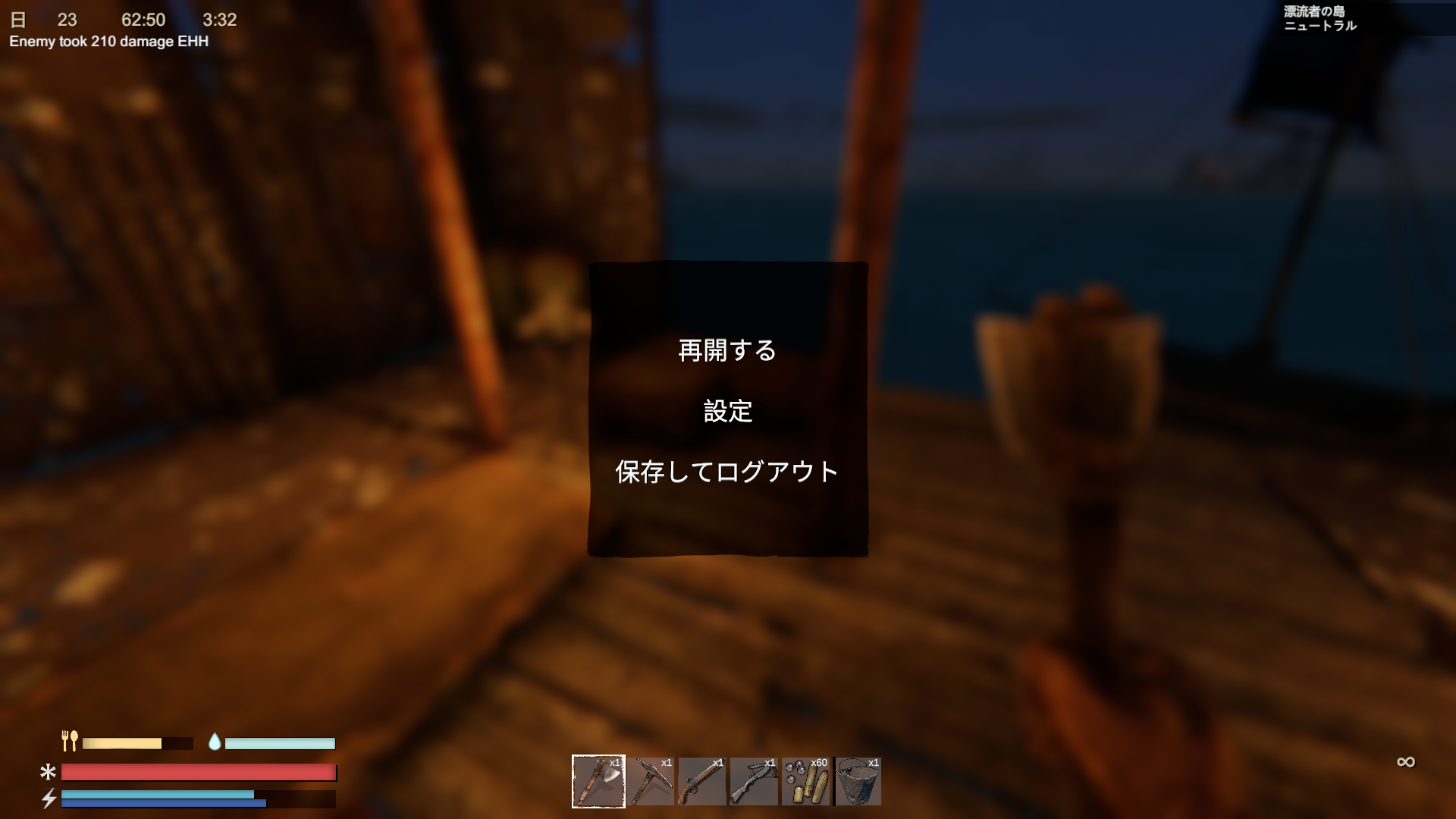 料理を作ると水筒ごとなくなる。シチューは空腹水分全回復、水中呼吸時間延長だが重いかも。 - 保存しないで終了したい→shift+tabで左上のゲームを終了を選ぶ。