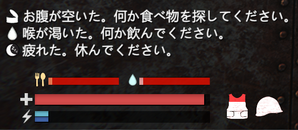 空腹値が20を下回ると「お腹が空いた。何か食べ物を探してください。」とメッセージが表示され、空腹ゲージが点滅する。