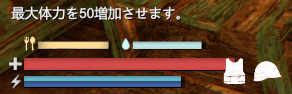 キノコと鳥のスープを食べると「空腹と喉の渇きの速度を減少させます」とメッセージが表示され、空腹ゲージと水分ゲージの減少が遅くなる。