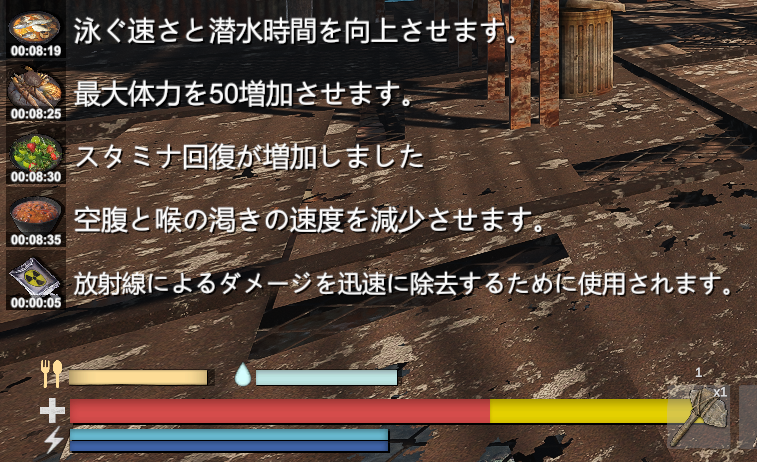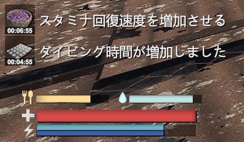 - バフのかかるアイテム使用時に、使用中のアイテムと残り時間が表示されるようになった。