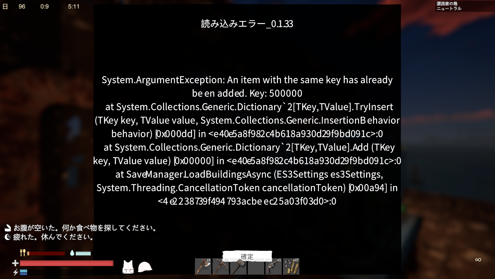 (筆者は3回目の読み込みでエラーを確認。アイテムは特に失われていない。)